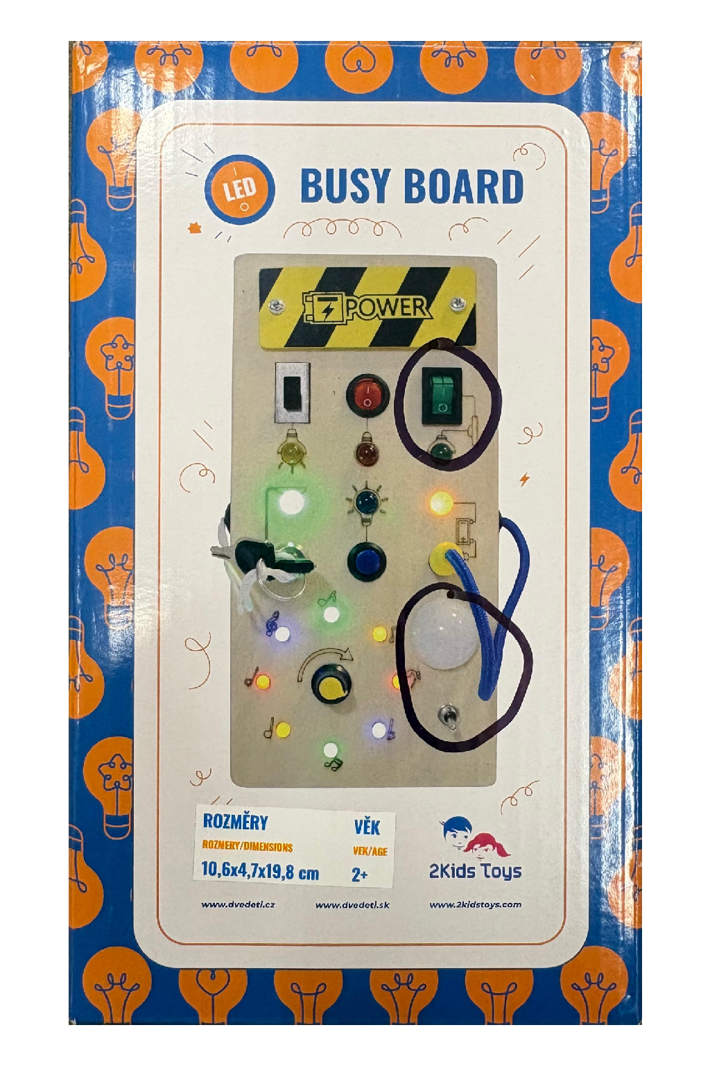 A 2Kids Toys LED Busy Board egy kreatív és fejlesztő játék, amely segíti a gyermekek finommotorikus készségeinek, logikai gondolkodásának és érzékszervi észlelésének fejlődését. A különböző kapcsolók, gombok és fények segítségével a gyerekek játékos formában ismerkedhetnek meg az alapvető mechanikai és elektromos működésekkel.