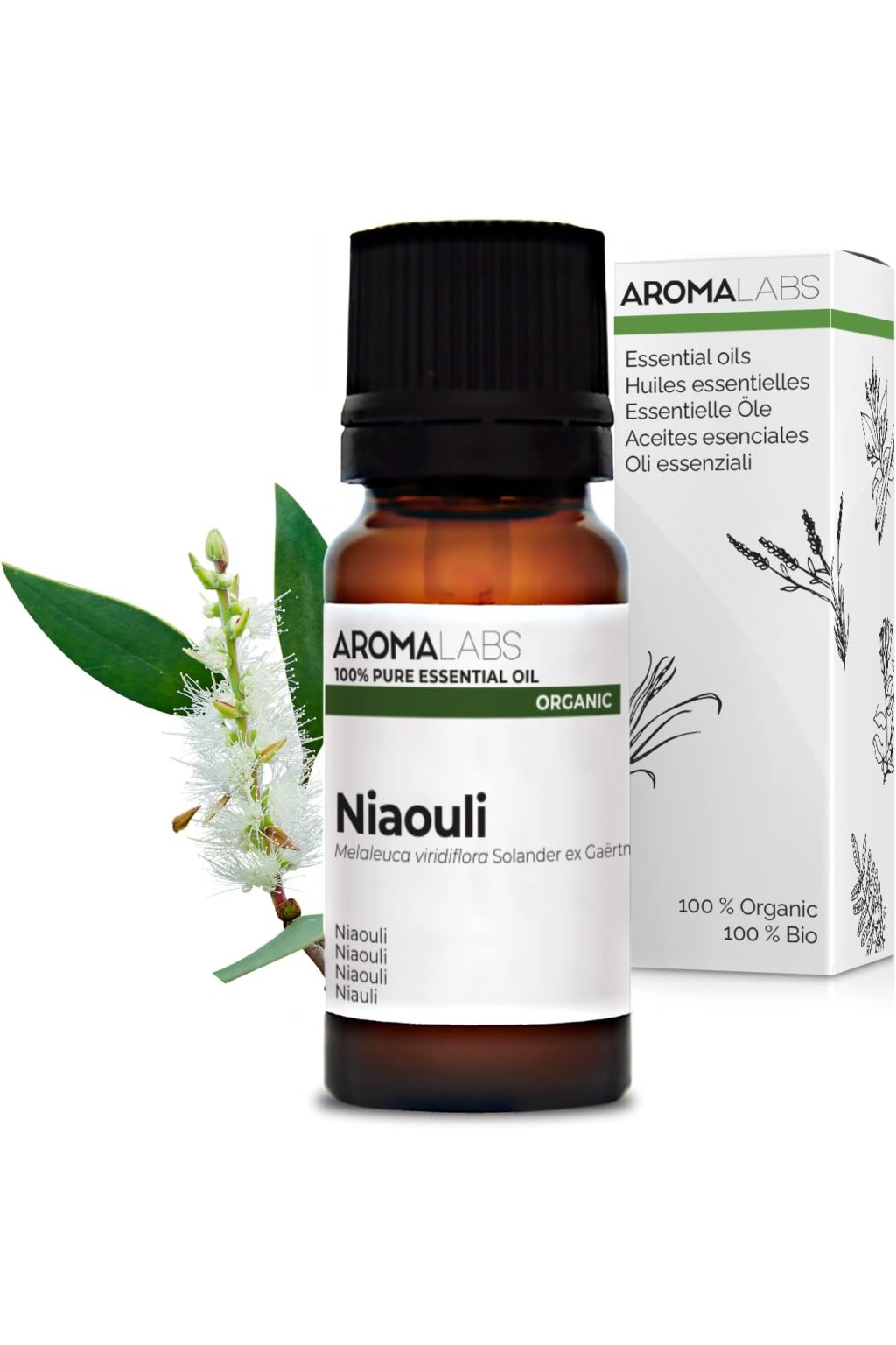 AROMA LABS BIO – NIAOULI illóolaj – 10 ml természetes aromaterápiás olaj, amelyet a Melaleuca quinquenervia fa leveleiből nyernek, és amely friss, enyhén kátrányos és gyógynövényes illatáról ismert.