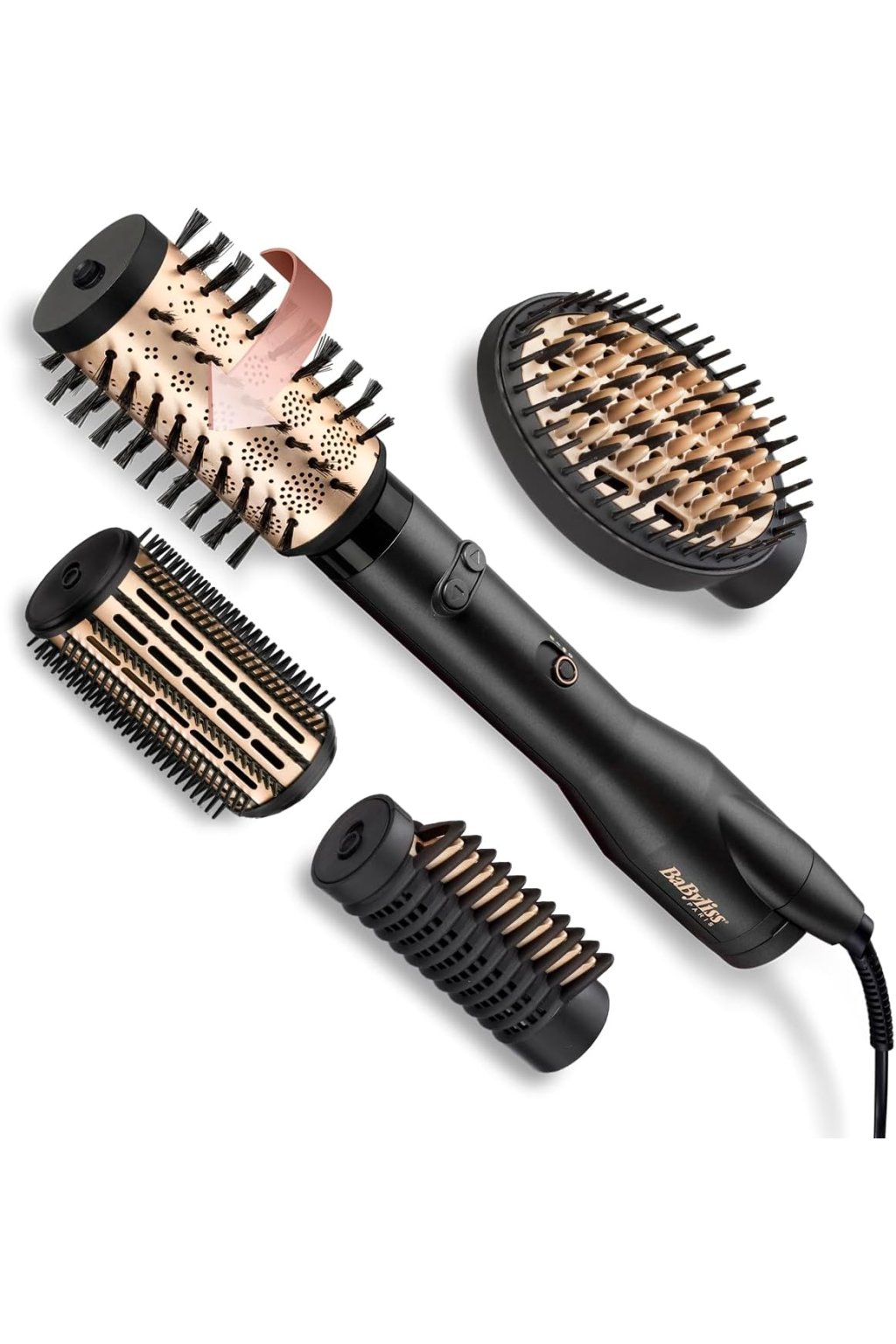 A BaByliss AS970E (650 W) egy forgó meleglevegős kefe, amely hajszárítót és formázó eszközt kombinál – ideális otthoni használatra, ha volumenes, hullámos vagy sima frizurát szeretne. Az ionizációs technológiának köszönhetően a haj fényes, sima és statikus elektromosságmentes marad. 650 W teljesítményével elegendő légáramot biztosít a hatékony szárításhoz és formázáshoz. A kábel forgatható és 2,5 m hosszú, ami növeli a használat kényelmét. A hátsó szűrő eltávolítható, így könnyen tisztítható.