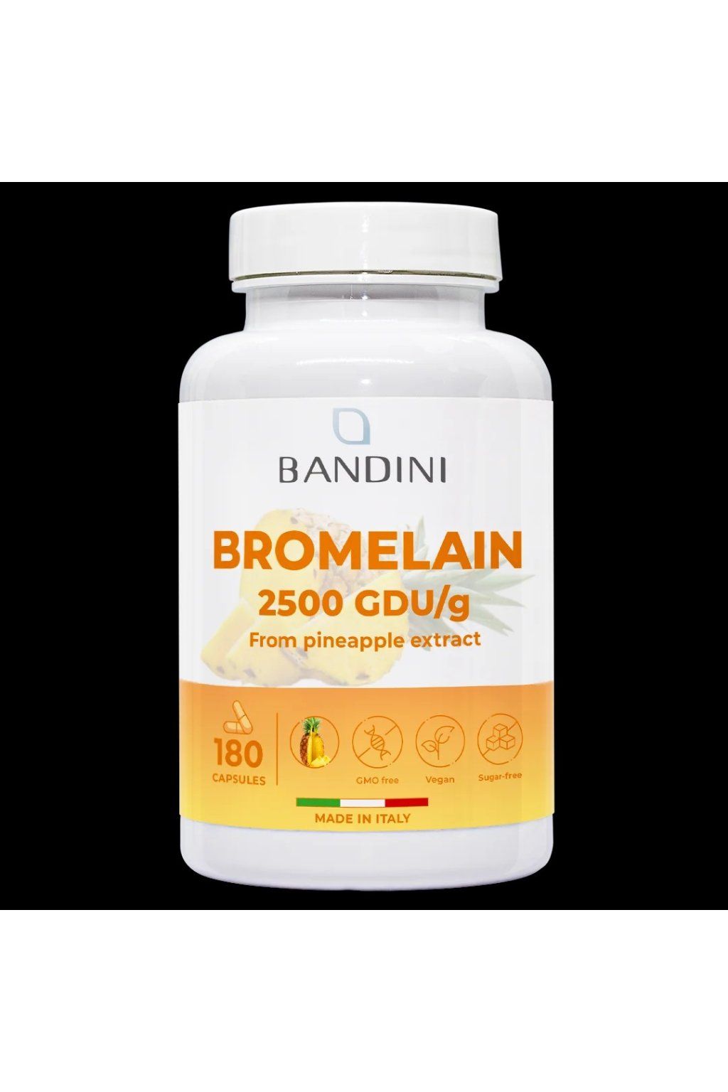 A Bandini Bromelina 2500 GDU/g* egy étrend-kiegészítő, amely bromelain, egy ananászból kivont enzimet tartalmaz. Minden kapszula 500 mg bromelain-t tartalmaz, ami grammonként 2500 zselatinban oldódó egységnek (GDU) felel meg. A bromelain emésztést elősegítő és gyulladáscsökkentő tulajdonságairól ismert, és gyakran használják az emésztés támogatására, a puffadás csökkentésére és a folyadékvisszatartás csökkentésére.