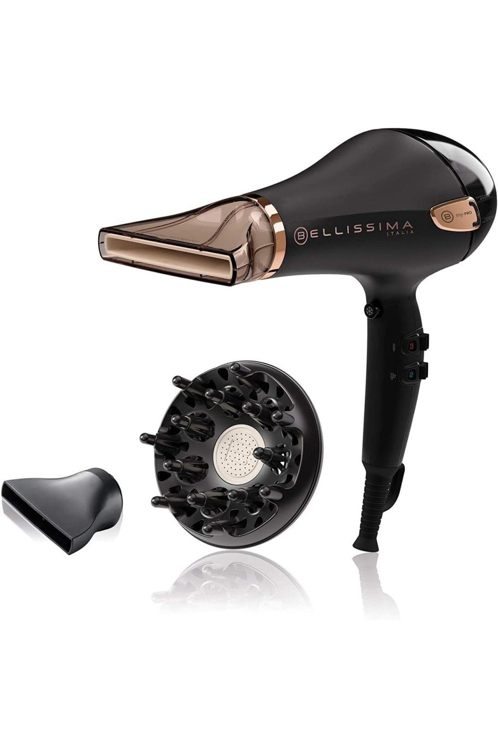 Bellissima Imetec Ceramic P5 3800, professzionális hajszárító finom és fényes hajhoz, kerámia technológia, 2300 W teljesítmény, ionizátor, diffúzor és kerámia szállító, AC, fekete, rózsaszín arany, akasztóhorog, 3 m.