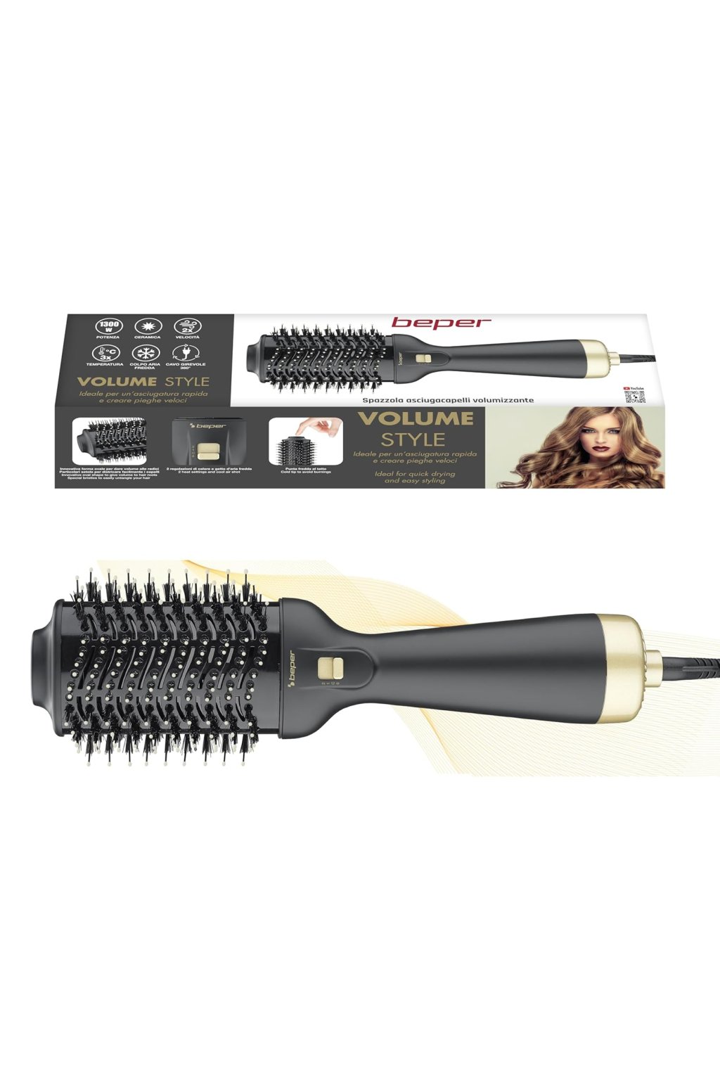 A BEPER P301PIS100 egy nagy teljesítményű hajszárító kefe, amely egyesíti a hajszárítás és a hajformázás kényelmét egy készülékben. 1300 W teljesítményével elegendő erőt biztosít a haj gyors szárításához és a frizura formázásához anélkül, hogy feleslegesen károsítaná a haj szerkezetét. A kefe úgy lett kialakítva, hogy simán kiegyenesítse a hajat, tömeget adjon a hajgyökerekhez és finoman megcsavarja a hajvégeket, így professzionális frizurákat lehet készíteni otthon. Ergonómikus alakjának és könnyű szerkezetének köszönhetően hosszabb használat esetén is kényelmesen kezelhető.