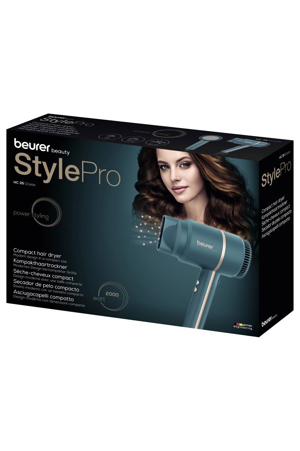 A BEURER HC 35 Ocean egy kompakt és nagy teljesítményű hajszárító, amelyet mindennapi otthoni használatra és utazáshoz is terveztek. 1600–2000 W teljesítményével gyorsan és hatékonyan szárítja a hajat, anélkül, hogy feleslegesen túlmelegítené. Az ionos technológiának köszönhetően a hajszárító csökkenti a statikus elektromosságot, segít megelőzni a haj göndörödését, és simábbá és fényesebbé teszi a hajat. A modern, Ocean színű kialakítás friss és stílusos hatást kelt, míg az ergonómikus fogantyú kényelmes tartást biztosít használat közben.