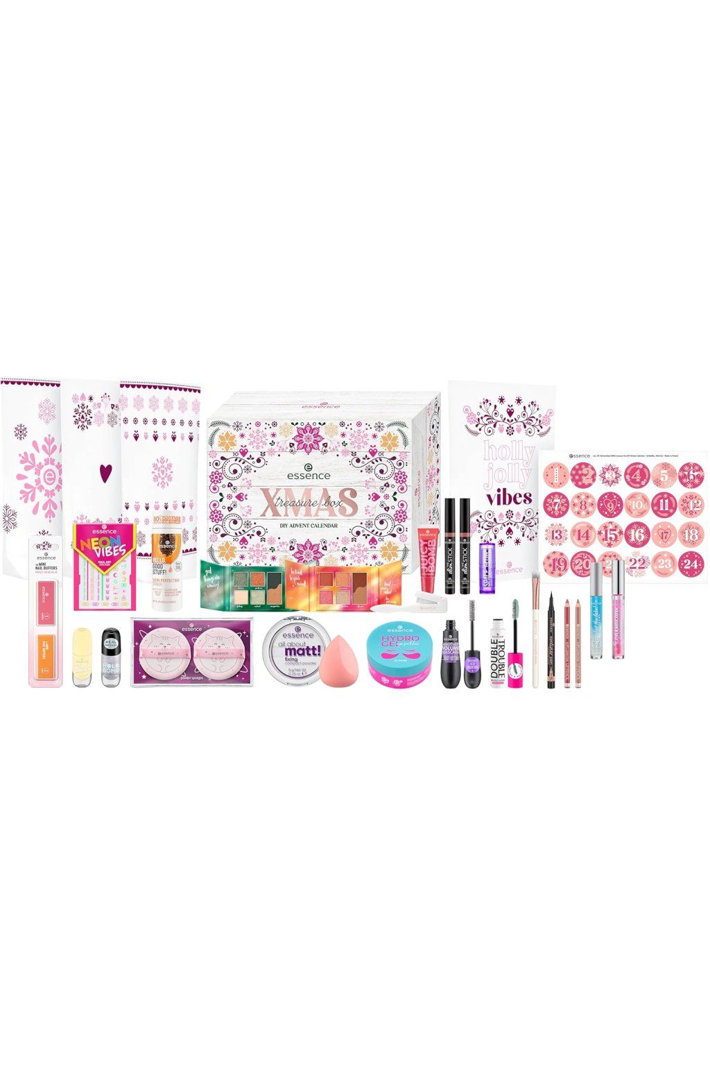Az Essence Xmas Treasure Box DIY adventi naptár minden decemberi napot kis ünnepi meglepetéssé varázsol. 24 exkluzív kozmetikai terméket tartalmaz az arc, a szem, az ajkak és a körmök számára, amelyek örömöt és szépséget hoznak az advent minden napján. A praktikus DIY szett papírzacskókkal és matricákkal lehetővé teszi, hogy a naptárat saját stílusodnak megfelelően alakítsd ki. Így minden nap új kincset fedezhetsz fel – a szempillaspiráltól és a szemhéjfestéktől a szájfényig és a körömlakkig. Ez az eredeti naptár ideális ajándéknak vagy saját örömödre a varázslatos karácsonyi időszakban.