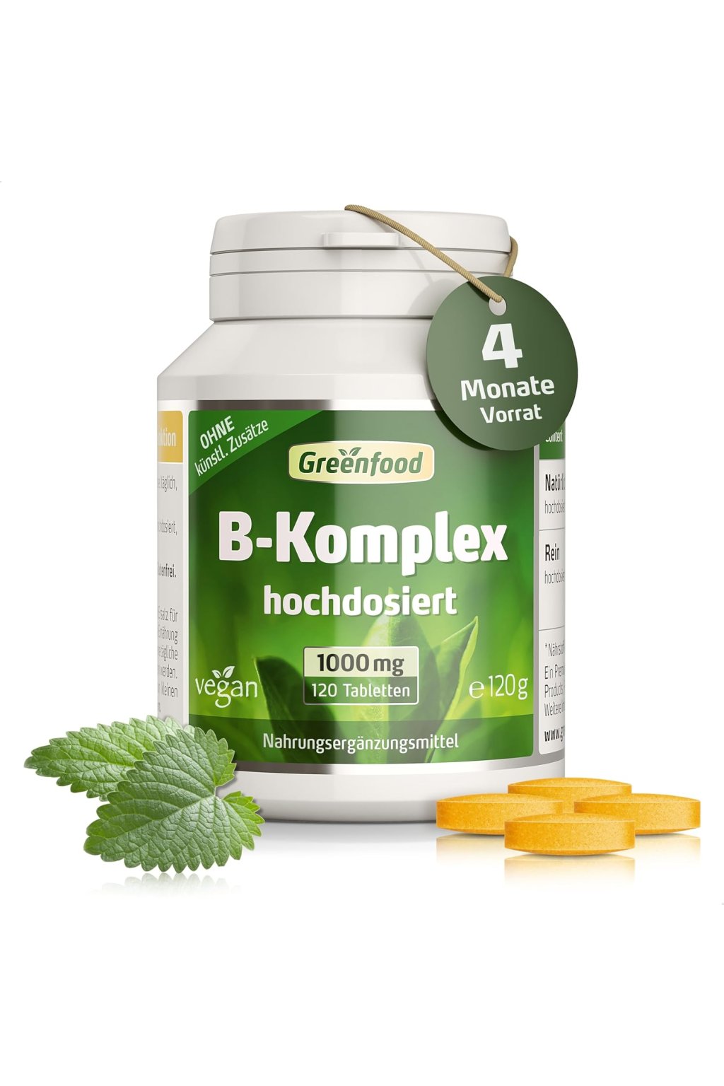 - A B-komplex 1000 mg B-vitamint tartalmaz, ami magas adag a napi adaghoz képest. A Greenfood B-komplex tabletták biológiai hozzáférhetősége magas, és a 120 tablettás kiszerelés és az ajánlott 1 tabletta adagolásnak köszönhetően a dózis könnyen és hatékonyan igazítható a napi szükségletekhez.
