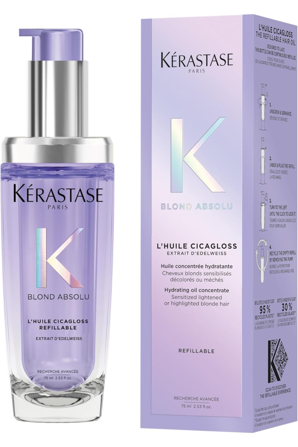 KÉRASTASE Blond Absolu Cicagloss Refillable Oil 75 ml egy luxus, többcélú hajolaj, amelyet kifejezetten szőke, világosított és melírozott hajra fejlesztettek ki. Könnyű, nem zsíros formula azonnal lágyítja és kisimítja a hajat, intenzív fényt ad neki, és megvédi a töréstől és a károsodástól. Az olaj elősegíti a haj rugalmasságát és megkönnyíti a fésülést, miközben megőrzi a színt és semlegesíti a sárga tónusokat. A praktikus adagolás és az utántölthetőség csökkenti a hulladékot és professzionális minőségű, fenntartható ápolást biztosít.