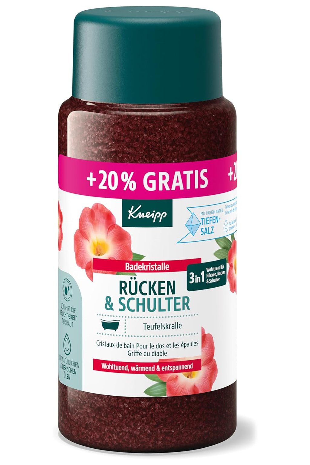A Kneipp fürdőkristályok a hátra és a vállakra, értékes ördögkarom kivonattal és természetes kajeput olajjal tartják a bőr nedvességét. A meleg víz nyugtató hatásával együtt az illóolajok kifejtik természetes illatukat.