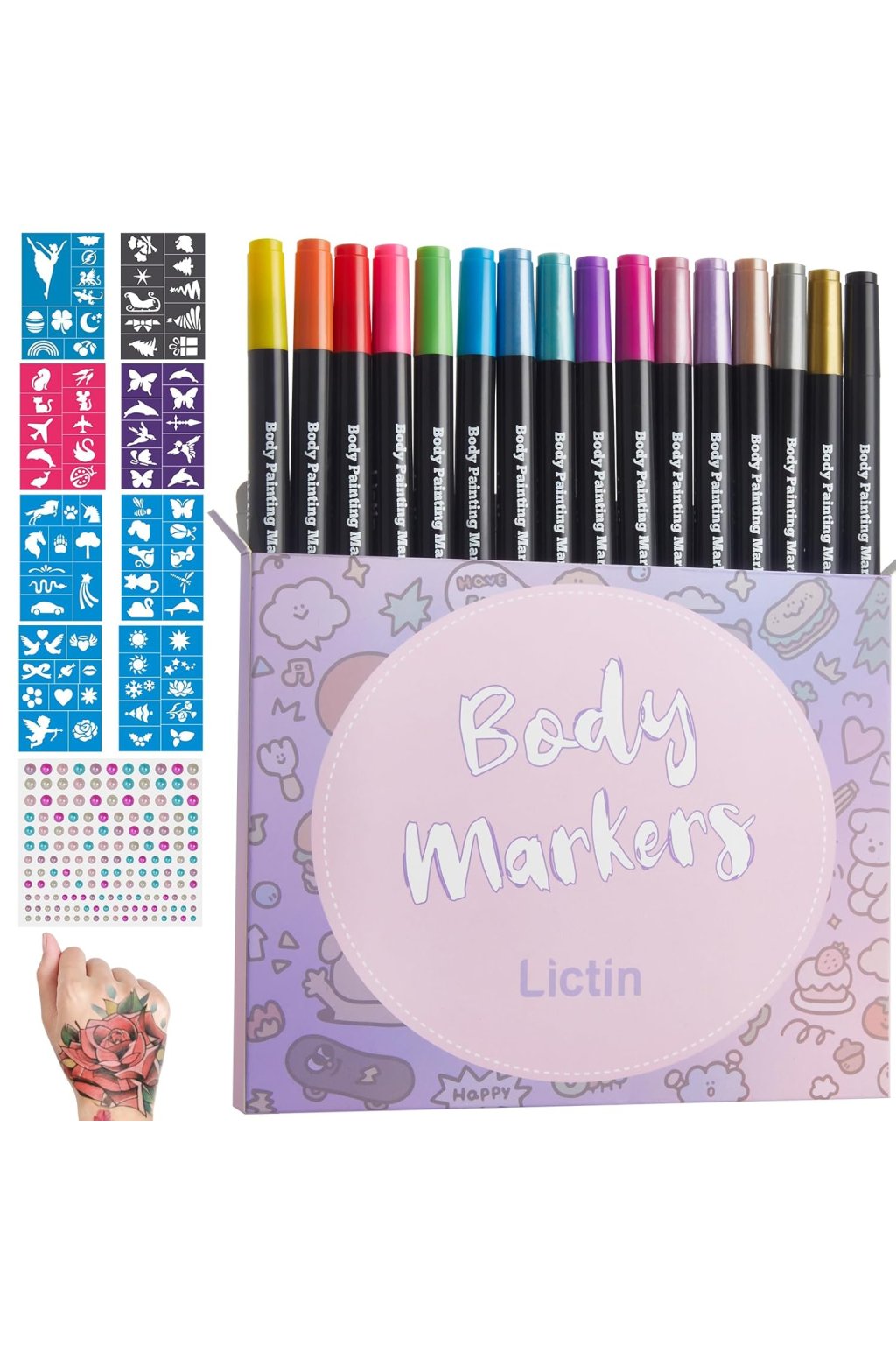 Lictin ideiglenes tetováló filctollak a bőrre, 16 színben, kétoldalas, 80 tetováló sablonnal
