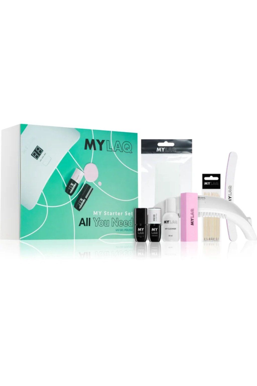 A MYLAQ Starter Set All You Need egy teljes gél manikűr kezdőcsomag, amely minden szükségeset tartalmaz ahhoz, hogy otthon, kényelmesen készíthessen tartós és fényes körmöket. A készlet gél lakkot, előkészítő termékeket és eszközöket is tartalmaz, így különösen alkalmas kezdőknek, de a rendszeres otthoni körömápoláshoz is. Tartalmazza a My Classy Nude gél lakkot (5 ml), az alap- és fedőlakkot (5 ml), a körömtisztítót (50 ml), reszelőt, polírozó blokkot, fa pálcikákat, tamponokat és LED-lámpát a géltermékek kikeményítéséhez.