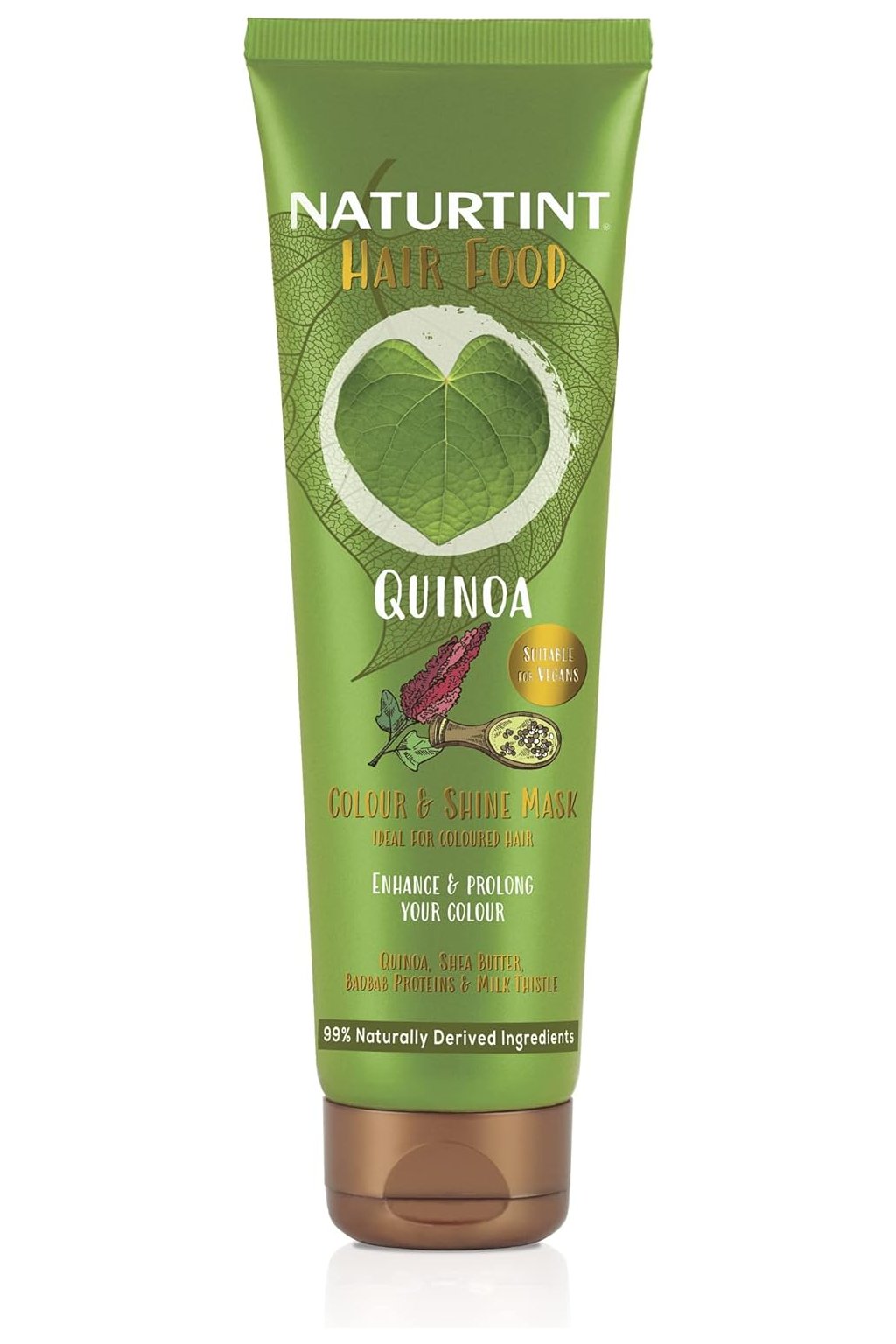 Naturtint Színes és fényes hajmaszk quinoával, 150 ml egy tápláló és szuperélelmiszer maszk normál és festett hajra, amely intenzíven hidratál, erősít és meghosszabbítja a szín tartósságát, ugyanakkor növeli a haj természetes fényét és bársonyos puhaságát. A Hair Food termékcsalád része, és hidrolizált quinoát tartalmaz, egy teljes értékű fehérjét esszenciális aminosavakkal, amely segít rögzíteni a színárnyalatot és kiemelni a haj fényességét. A maszkot sheavaj és mariánska bodliak kivonat egészíti ki, amelyek táplálják a hajat, csökkentik a törékenységét és könnyen fésülhetővé teszik. A baobab fehérjék vitalitást, erőt és rugalmasságot adnak a hajnak, így az egészségesebbnek és fiatalosabbnak tűnik. A maszkot samponozás után ajánljuk használni – vigye fel a nedves hajra, hagyja hatni körülbelül 4 percig, majd alaposan öblítse le. Naponta vagy intenzív kúraként hetente egyszer-kétszer használható.
