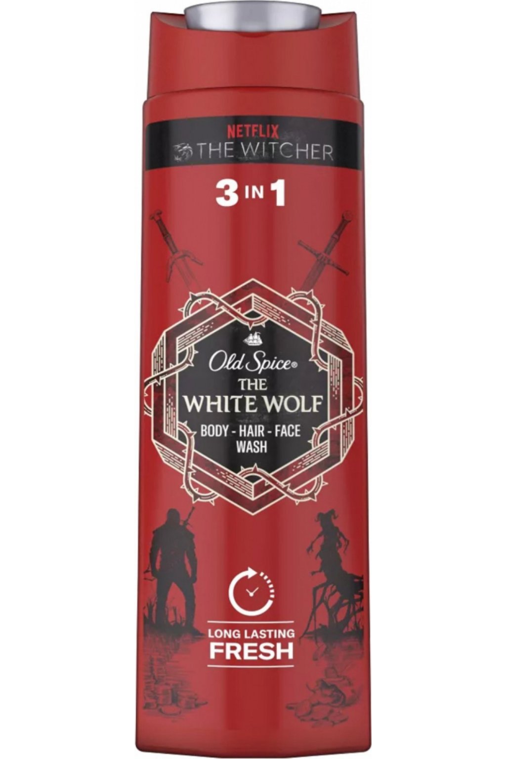 A 2 az 1-ben Old Spice Whitewolf tusfürdő és sampon gyorsan és hatékonyan mossa az egész test bőrét és a hajat is.