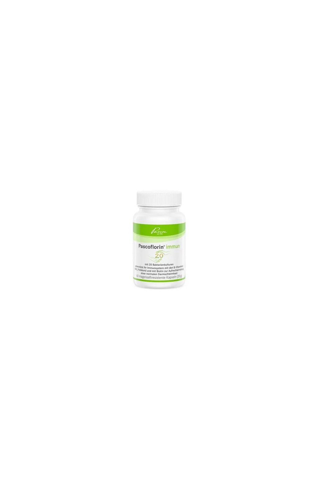 APascoe Pascoflorin Immun az immunrendszer támogatására kifejlesztett étrend-kiegészítő. 20 speciálisan kiválasztott baktériumkultúrát (tejsavképző) tartalmaz, valamint B12-vitamint, folsavat és biotint. Ezek az összetevők együttesen hozzájárulnak az egészséges bélnyálkahártya fenntartásához és az általános immunműködés támogatásához.