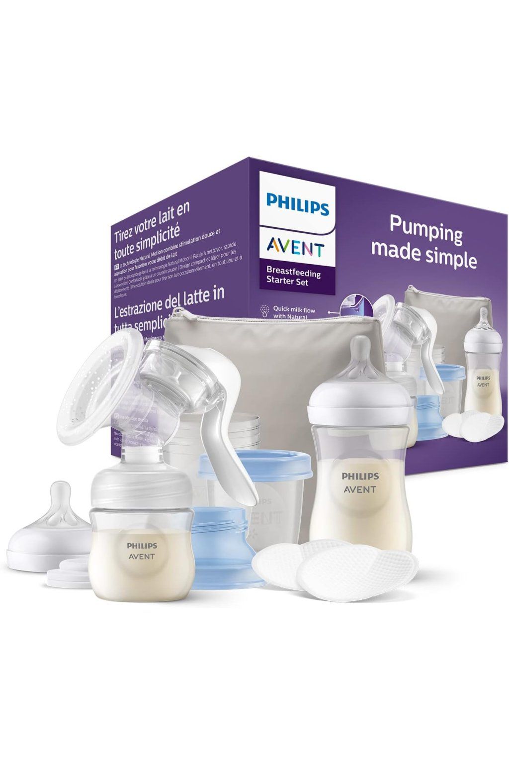A kezdőcsomaghoz gazdag tartozékok tartoznak: palackok (125 ml és 260 ml), tárolóedények adapterrel, cumi, tömítőkorong, egyszer használatos melltartóbetétek és hőszigetelő tok, ami lehetővé teszi a tej nemcsak lefejtését, hanem tárolását és közvetlen adagolását is.