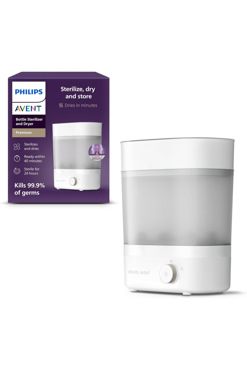 A Philips AVENT Premium elektromos gőzsterilizáló praktikus és biztonságos módja annak, hogy a cumisüvegeket, cumikat és egyéb gyermek kiegészítőket tökéletesen tisztán és higiénikusan tartsa. Gyors gőzsterilizálást alkalmaz, amely hatékonyan eltávolítja a baktériumok 99,9%-át vegyszerek használata nélkül. Intelligens kialakításának köszönhetően egyszerre akár 6 cumisüveget is befogad, és könnyen beállítható különböző típusú cumisüvegekhez és kiegészítőkhöz. Ez a sterilizáló ideális mindennapi használatra, és biztosítja a szülőknek, hogy gyermekük tiszta és biztonságos tárgyakat használjon.