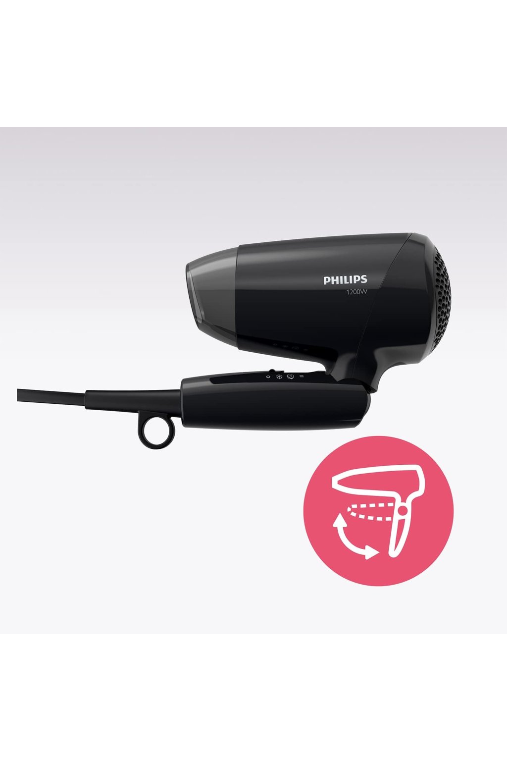 - Kompakt és könnyű kialakítás, lehajtható fogantyúval és akasztóval: a hajszárító könnyen összecsukható, így ideális utazáshoz vagy helytakarékossághoz.