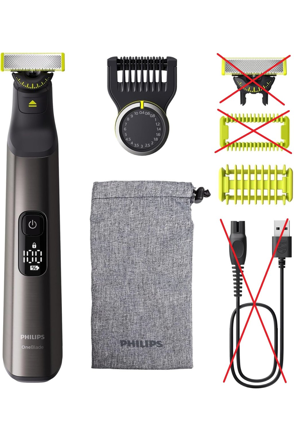 A csomag nem tartalmaz töltőkábelt, pót borotvafejet és bőrvédő sapkát.