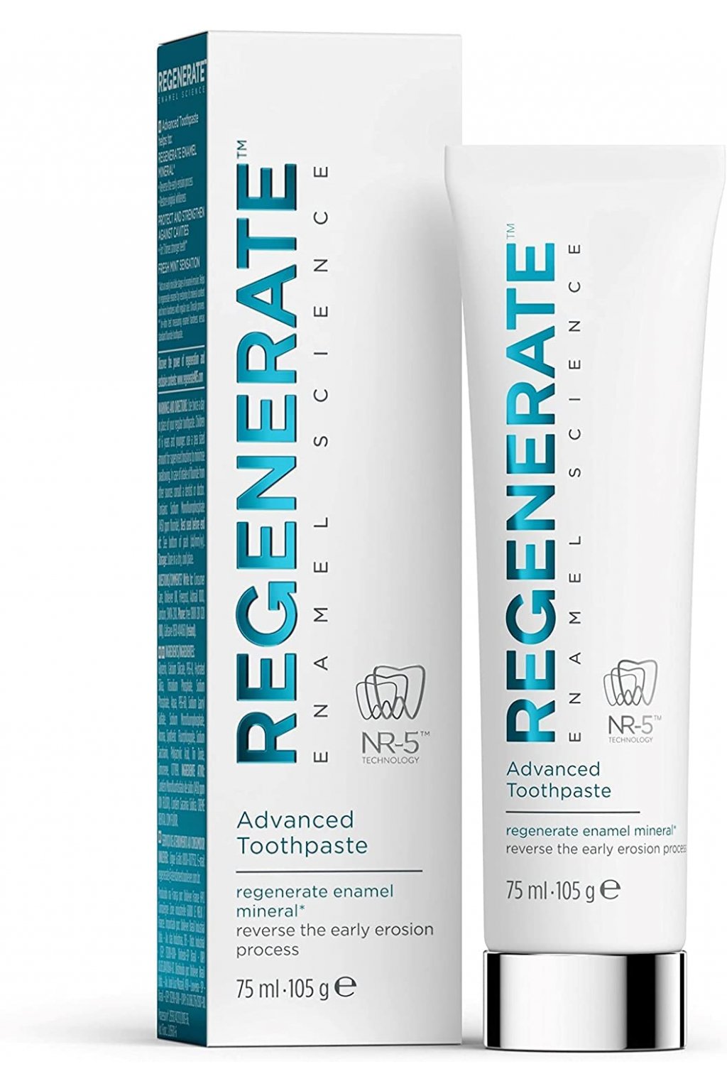 A REGENERATE Enamel Science fogkrém az exkluzív és klinikailag bizonyított NR-5 technológiával működik. Az NR-5 összetevők kombinációja friss