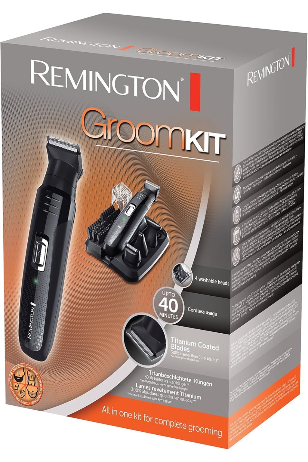 A Remington Groom Kit PG6130 egy sokoldalú vágókészlet éles pengékkel és felhelyezhető fejekkel, amely ideális a szakáll, az áll, a haj és a részletek precíz és kényelmes ápolásához otthon.