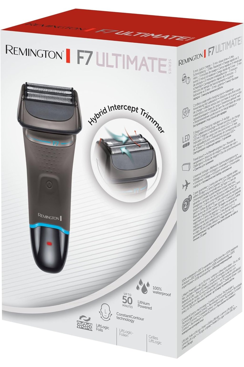 A Liftlogic pengék felemelik az alacsonyan fekvő szőrszálakat, míg a hibrid vágó a hosszabb szőrszálakra összpontosít, így az F7-tel a borotválkozás teljesen könnyedén megy. A lítium-ion akkumulátor 50 perc vezeték nélküli működést biztosít, és az 5 perces gyorstöltési funkciónak köszönhetően elegendő energiát kapsz a megjelenésed befejezéséhez.