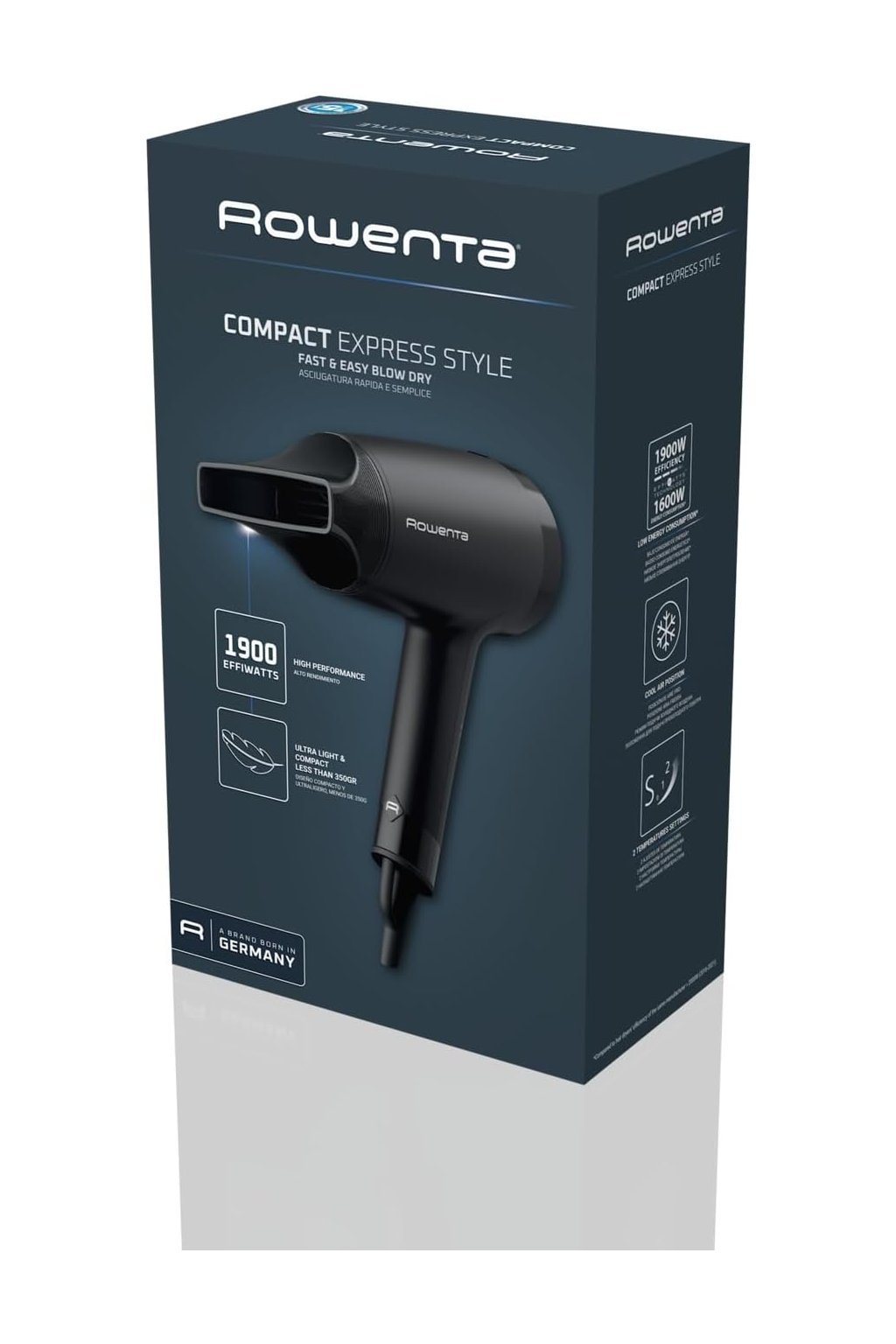 Rowenta CV1801 Express Style hajszárító, 1900 W teljesítmény, 2 beállítás, nagy teljesítmény, hideg levegő gomb, 1,8 m tápkábel, kompakt és ultrakönnyű kialakítás, fekete.