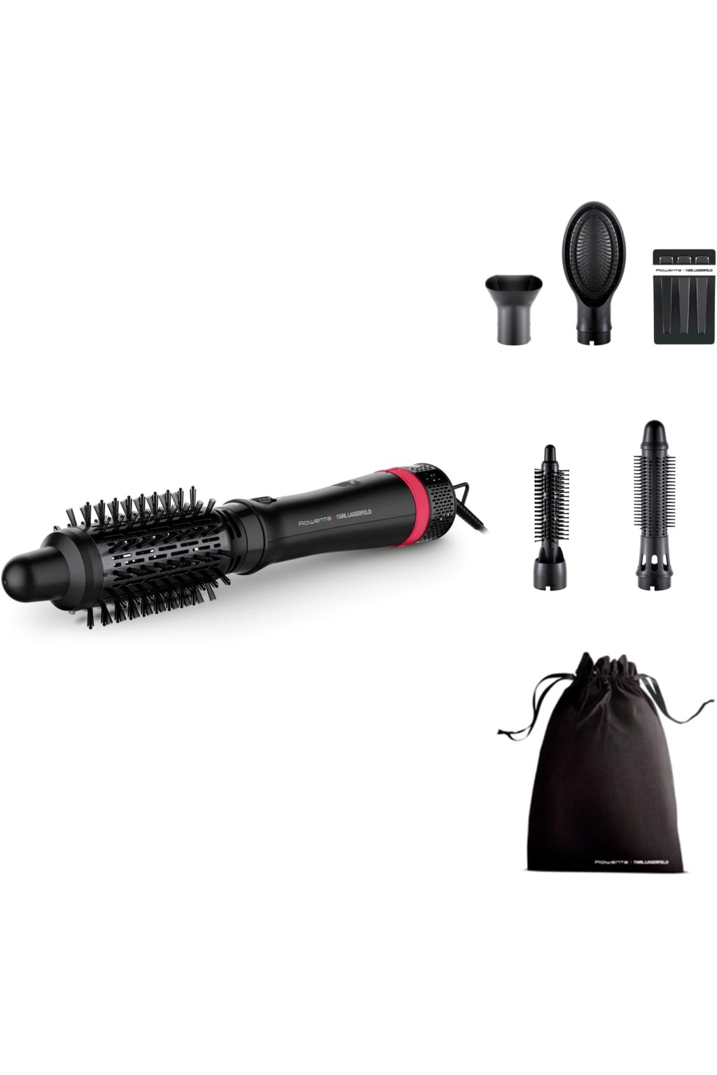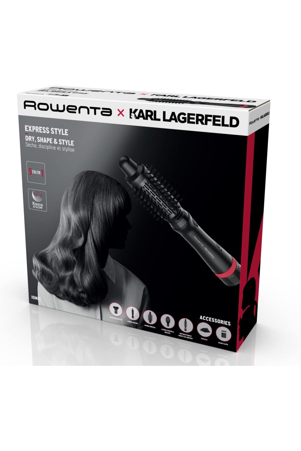 A Rowenta EXPRESS STYLE AIR STYLE & CURL CF635LF0 Karl Lagerfeld egy multifunkcionális meleglevegős styler több felhelyezhető fejjel és ionos technológiával a gyors szárításhoz, egyenesítéshez és hullámzáshoz egy készülékben.