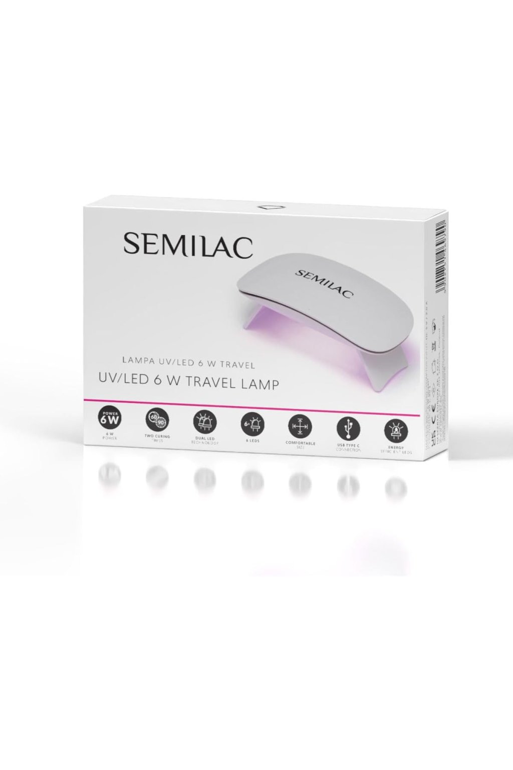 A Semilac UV/LED Travel Lamp Mini 6 W egy kompakt és hordozható eszköz, amely UV/LED gél lakkok és gél termékek keményítésére szolgál. 6 W teljesítményével ideális választás gyors kiegészítő használatra otthon vagy utazás közben, amikor egyszerűen és hatékonyan szeretnéd ápolni a körmeidet nagy eszközök nélkül. Kicsi és könnyű formája elfér egy kozmetikai táskában, bőröndben vagy hátizsákban, így bárhol ápolhatja a körmeit – nyaraláson, barátnőjénél vagy a munkahelyén.