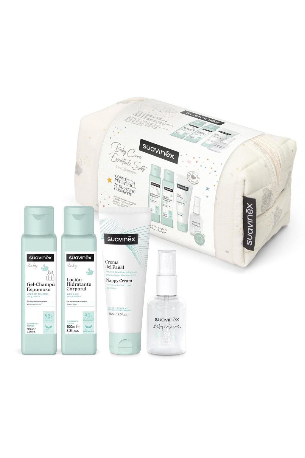 A Suavinex Beige Dreams gyermek fürdőtáska ajándékkészlet egy praktikus és stílusos szett, amelyet újszülöttek és kisgyermekek bőrápolására terveztek. A szett tartalmaz egy 100 ml-es sampon-gélt, egy 100 ml-es hidratáló krémet, egy 75 ml-es pelenkacserélő krémet és egy 50 ml-es kölnit praktikus utazócsomagolásban, amely megkönnyíti a szállítást és a használatot otthon és utazás közben egyaránt. A termékek kíméletesek, bőrgyógyászatilag teszteltek és alkalmasak az érzékeny gyermekbőrre, segítenek fenntartani a bőr hidratáltságát, védelmét és frissességét.