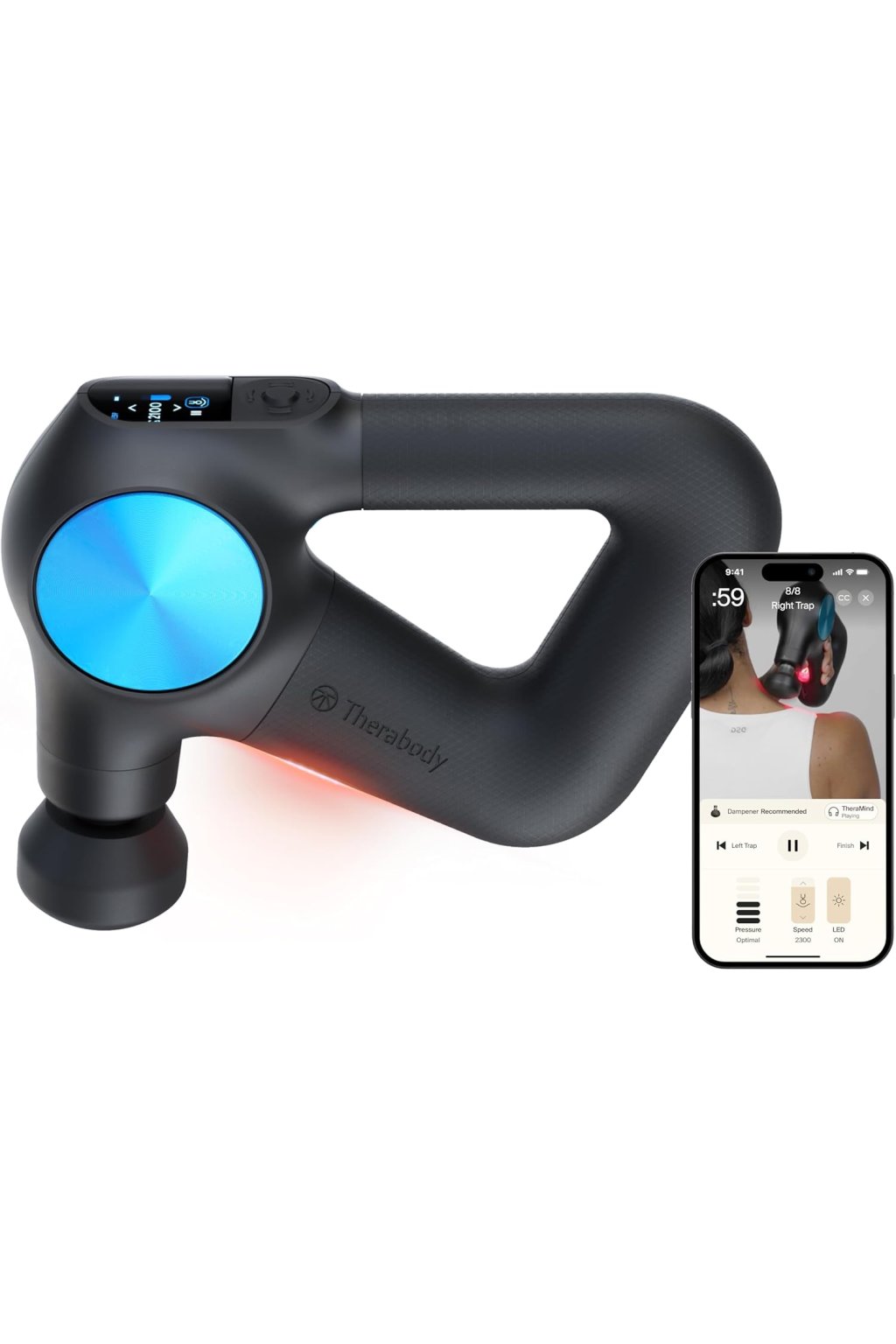 Theragun PRO Plus 6-in-1 mélyszöveti masszázspisztoly - Kézi személyi masszázsgép az egész test fájdalmainak és izomfeszültségének enyhítésére, biometrikus légzéssel, rezgéssel és fűthető fejjel.