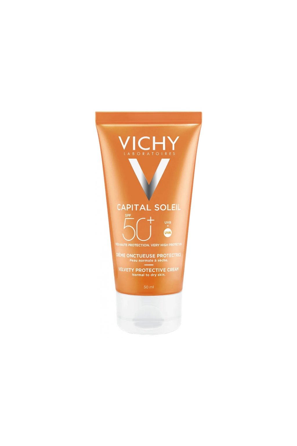A Vichy Capital Soleil Velvety Protective Cream SPF50+ 50 ml egy krémes, vízálló napvédő krém, rendkívül magas védelmi faktorral, normál és száraz, érzékeny bőrre. Hipoallergén.