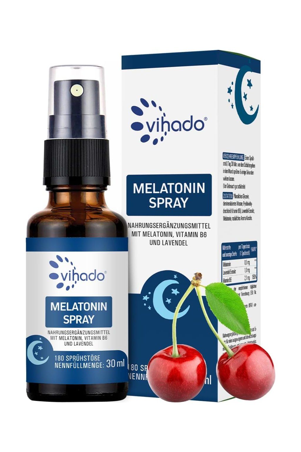 Növényi glicerin, demineralizált víz, piridoxin-hidroklorid (B6-vitamin), levendula kivonat, melatonin, természetes aroma cseresznye.