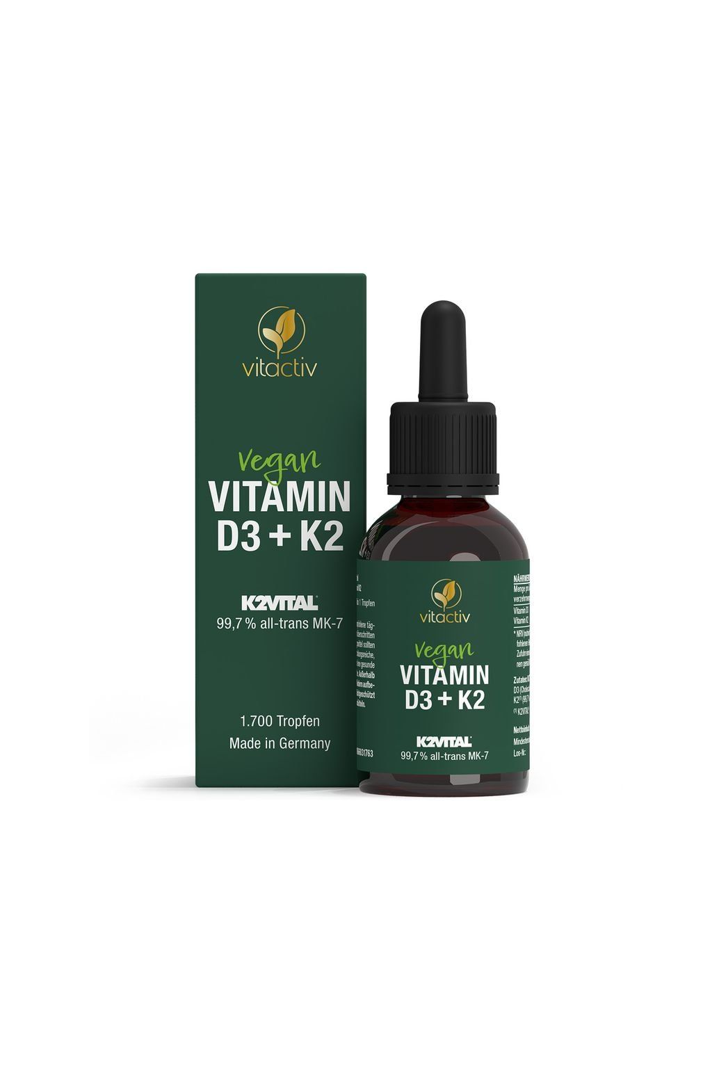 Összetevők: Kókusz alapú MCT-olaj; D3-vitamin (kolekalciferol zuzmóból); K2-vitamin(1)(99,7%-a az összes transz MK-7-nek).(1)® K2VITAL